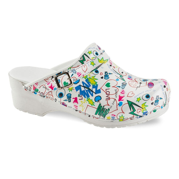 Made of high quality water resistant patent-leather with print in fresh colors. Slip resistant and schock absorbing PU outersole with an anatomic footbed, ensures that the clog is comfortable during a long working day.